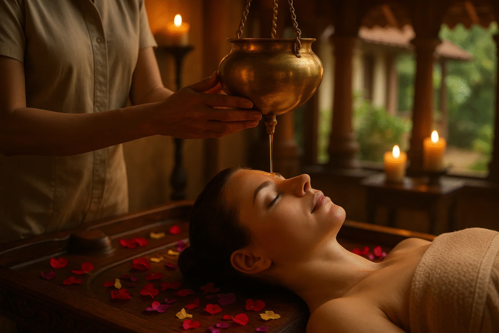 Warm medicated oil poured continuously on the forehead calms the nervous system, reduces stress hormones, and improves the heart-mind connection. Read about Shirodhara treatment benefits for overall wellness.